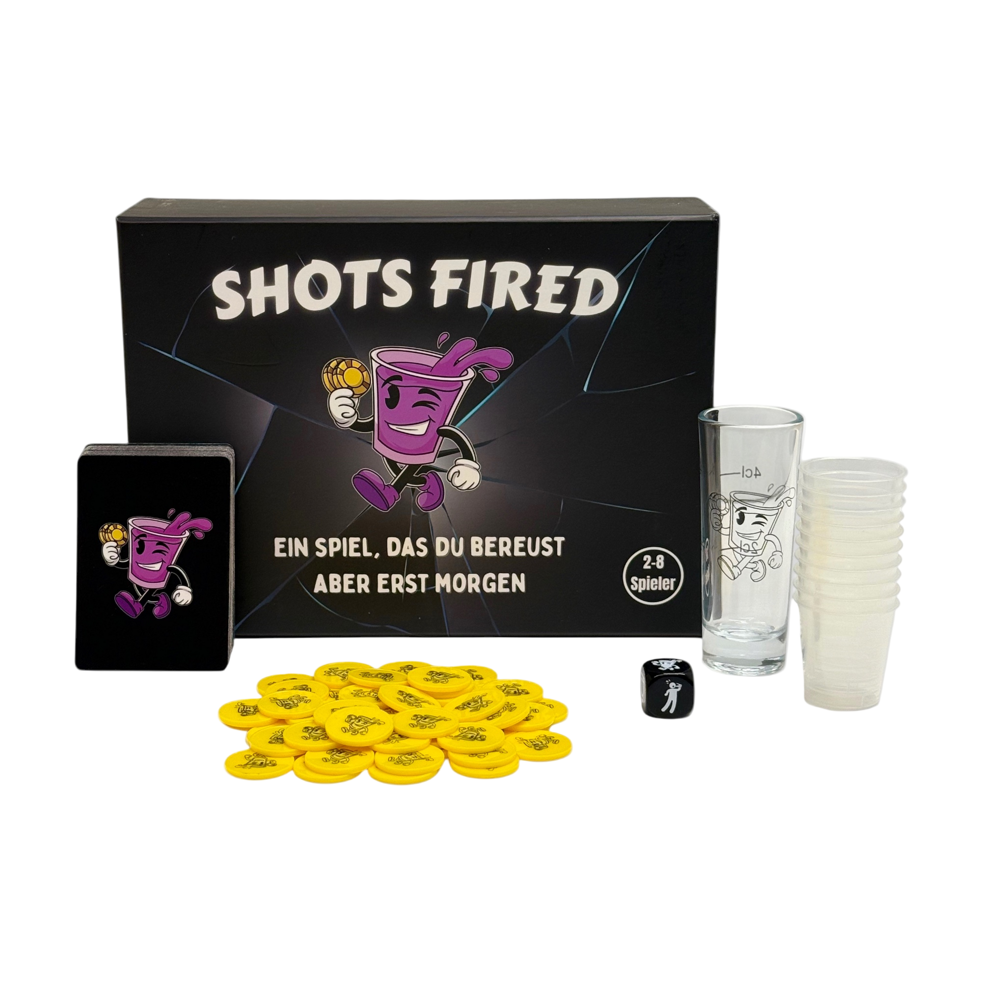 Im Lieferumfang enthalten sind: die Box inklusive dem integrierten Spielfeld, 48 Spielkarten, 1 Spezialwürfel, 1 großes 60ml Shotglas, 10 spülmaschinenfeste Shotbecher, 50 Coins.